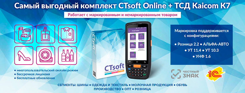 Комплект терминала сбора данных Kaicom K7 CTsoft включает в себя предустановленное программное обеспечение CitySoft, поддерживающим все распространенные складские операции, а также работу с товарами, уже попавшими в систему маркировки Честный ЗНАК: